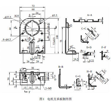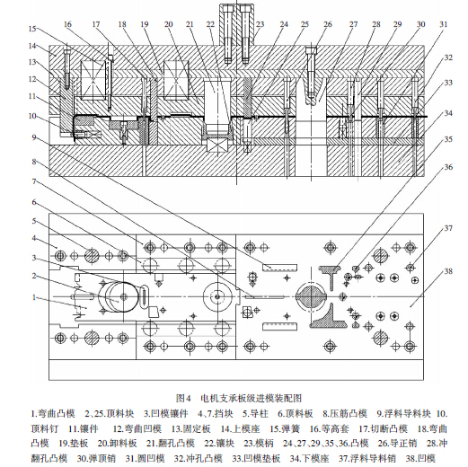 隨著勞動力成本的不斷上升,越來越多的企業采用自動送料的級進模進行沖壓生產。圖1所示是干衣機的電機支承板,生產批量很大,用5副單工序模生產,需經常更換模具,生產輔助時間多,生產效率很低。