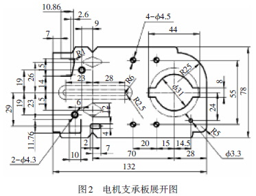 電機支承板如圖1所示,材料為厚t=2.0mm的鍍鋅鋼板,外觀質量要求高,表面無傷痕。該制件彎曲結構較復雜,彎曲側有兩處翻邊孔和兩處Z形彎曲向內凸起,用級進模生產的難點是制件頂出困難,模具強度不易保證。電機支承板展開圖如圖2所示,毛坯尺寸按中性層展開。長邊彎曲處有加強筋參與彎曲,材料變形不均勻,各處展開長度不同,可按無加強筋的彎曲展開,長邊彎曲處通過修成不同的彎曲半徑來調整尺寸。大翻邊孔兩側有缺口使翻邊展開尺寸計算不準,準確的展開尺寸只能通過修正線切割毛坯試翻孔模來確定,保證翻邊高度一致。