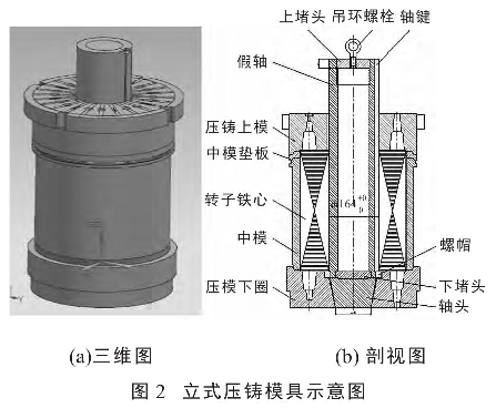 圖2為轉子壓鑄模具裝配示意圖,其中圖(a)為該模具的三維視圖,圖(b)為該模具的剖視圖。該模具具有重量輕,造價低,通用性好,可以同時滿足不同很數(2~8很)、不同高度的轉子沖片的壓裝。